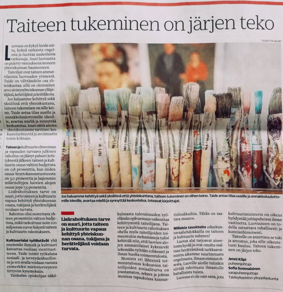 Kirjoitimme joulukuussa 2018 silloisen Taideyliopiston ylioppilaskunnan puheenjohtajan Jenni Kilven kanssa mielipidekirjoituksen Turun sanomiin.